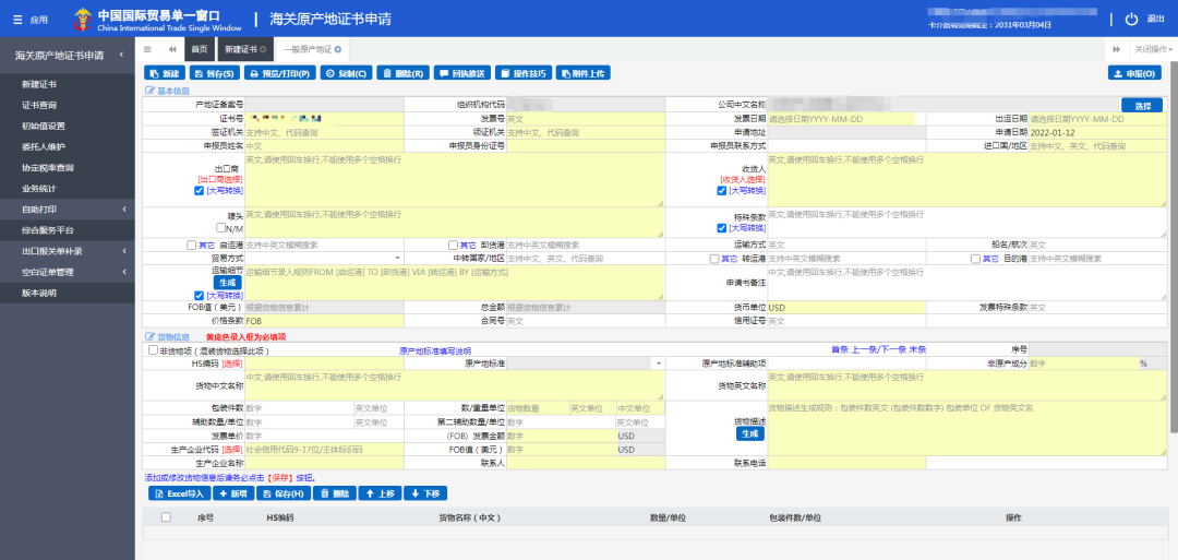 录入数据界面中,黄色底框的字段为必填项。请根据实际情况逐一填写基本信息、货物信息。