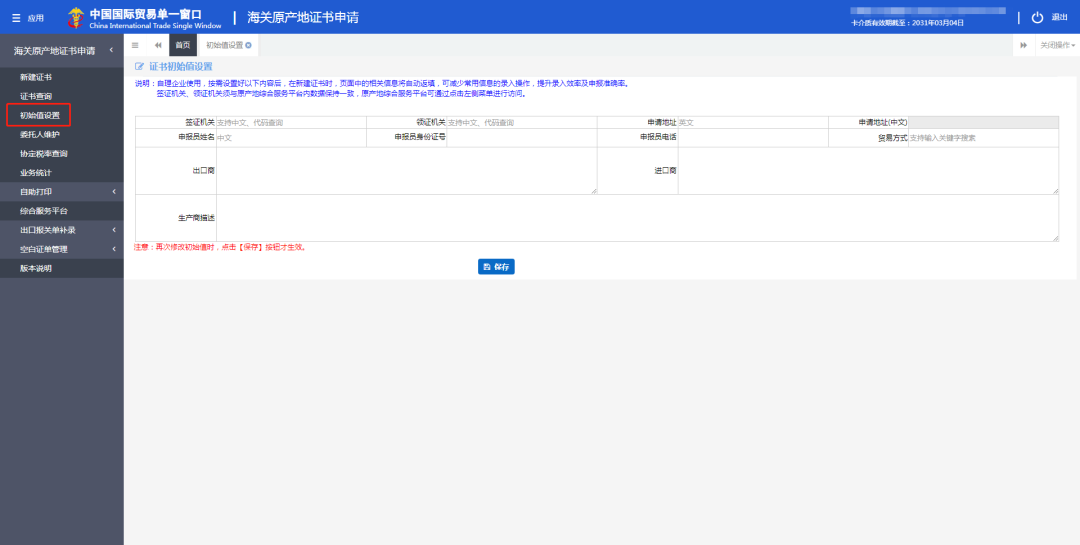 自理企业点击左侧菜单栏“初始值设置”,可设置原产地证初始值,如签证机关、领证机关、申请地址、出口商英文、申报员身份证号码等。在新建证书时,页面中的相关信息将自动返填,减少了常用信息的录入操作,提升了录入效率及申报准确率。