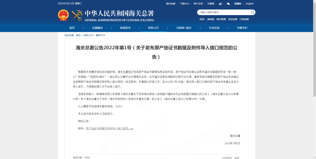 首先,我们来看一下海关总署公告2022年第1号(关于发布原产地证书数据及附件导入接口规范的公告),公告地址:http://www.customs.gov.cn/customs/302249/2480148/4110189/index.html,点击下载公告附件《原产地证书数据及附件导入接口规范》可查看相关接口规范哟。