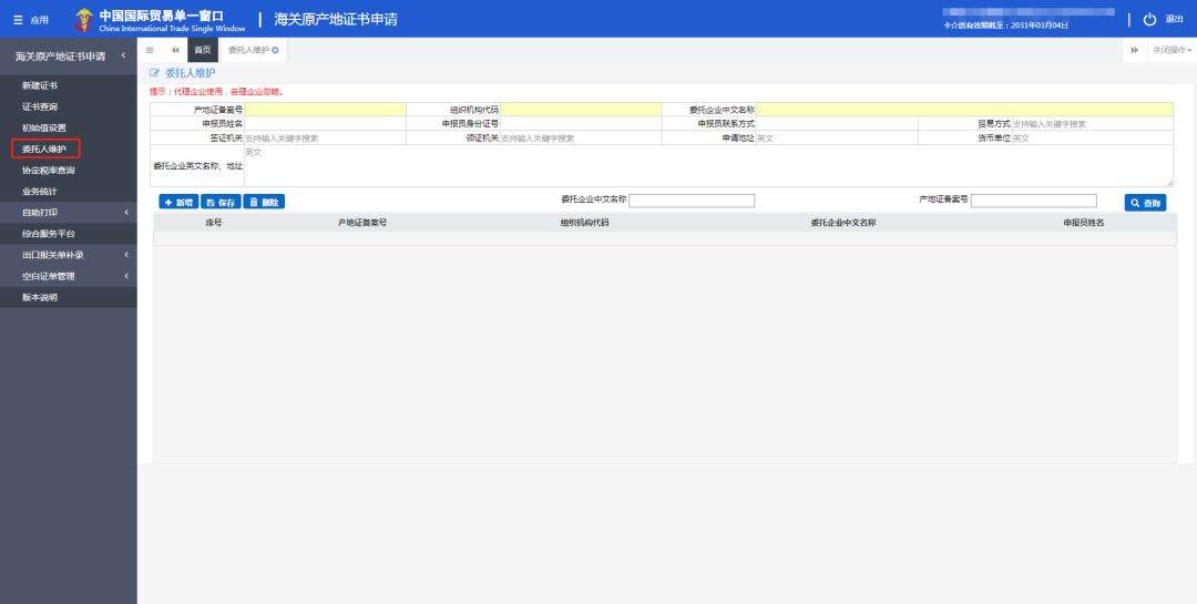 具有代录入资质的企业点击左侧菜单栏“委托人维护”,可以录入委托人产地证备案号、组织机构代码、委托企业中文名称。