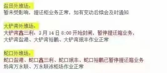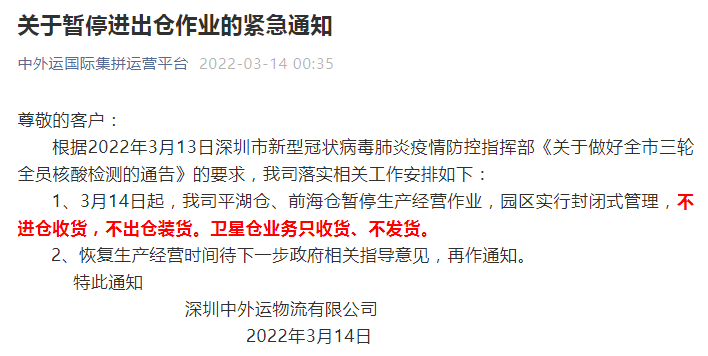 自今日(3月14日)起,深圳中外运物流有限公司的平湖仓、前海仓暂停生产经营作业,园区实行封闭式管理,不进仓收货,不出仓装货。卫星仓业务只收货、不发货。