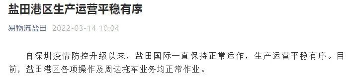 欧华物流也发布公告,华南区新和仓于3月14日至3月20日暂停收货。此外,多家中国交通运输协会航运物流分会华南地区跨境电商会员企业反馈,深圳地区80%〜90%的仓库已暂停运营,进入封控阶段。目前盐田综合保税区员工暂时居家办公,供港物资可以申请加班。据深圳业内人士介绍,除个别货柜车停车场暂停车辆进出及少数港口外堆场暂停作业外,目前深圳地区的疏港运输可以维持基本运行。