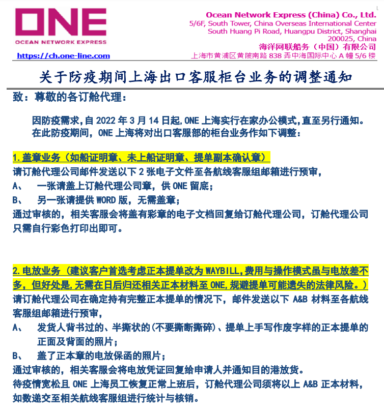 温馨提示:敬请各位司机在前往SCT、CCT、MCT闸口前自查健康码,码头将严格检查司机的行程码、绿码,非绿码一律禁止进入码头,同时上报疾控处理。为避免拖车因黄、红码在港区滞留,加剧拥堵,请积极配合码头的防疫要求。对于2月19日首航的供港物资海上快线天天班服务,盐田国际强调,将继续全力保障该“供港生命线”畅通稳定。截至3月13日,“盐田-香港”海上快线已运送45023吨货物至香港。盐田国际将继续同时紧抓疫情防控和港口生产“双统筹”工作,并继续与各级政府及口岸单位保持协作,共同保障盐田港生产运营平稳有序。此外,从今天(14日)起,上海全部客运站暂停营运,中小学启动线上教学工作。目前ONE已经发布通知,3月14日起,ONE上海实行在家办公模式,直至另行通知。其他船公司等情况请详细对应船司。