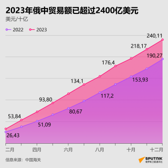 2023年1-12月,中国与俄罗斯货物贸易累计进出口额2401.1亿美元,同比增长26.3%,创下历史新高。