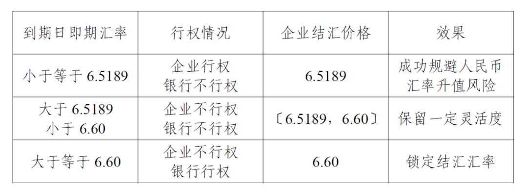 到期日,若即期汇率小于等于6.57,企业行权,以 6.57 结汇 500 万美元,企业避免了人民币大幅升值带来的风险;如果即期汇率大于 6.57,银行行权,企业以 6.57 结汇 1000 万美元,但 6.57 的结汇