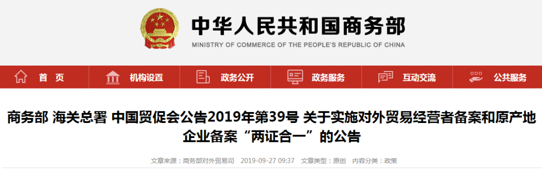9月27日,商务部、海关总署、中国贸促会发布关于实施对外贸易经营者备案和原产地企业备案“两证合一”的公告,决定自2019年10月15日起,在全国范围内推广对外贸易经营者备案和原产地企业备案“两证合一”改革工作。