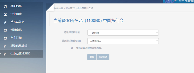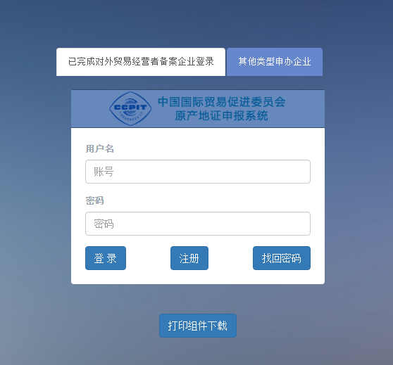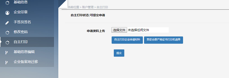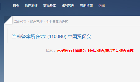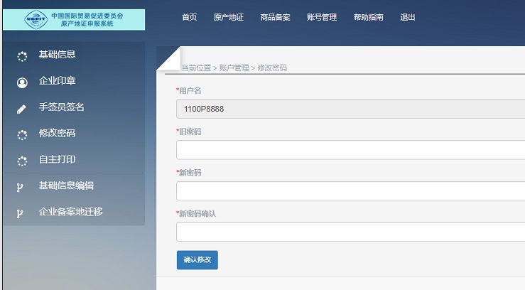 “两证合一”实施后贸促会原产地证书申办流程和有关服务事项办理说明 “两证合一”实施后贸促会 原产地证书申办流程 2019年10月15日,对外贸易经营者备案和原产地企业备案“两证合一”系统上线后,贸促会原产地证书申办流程如下: 企业完成对外贸易经营者备案后,登录贸促会原产地证书申报系统: http://qiye.ccpiteco.net 首次登录直接输入“统一社会信用代码”,点击登录会显示初始密码: 登录成功后会跳转到修改密码页面。 点击“新建手签员”,填写相关信息,下载手签员授权书填写后提交。 点击“企业印章”,按界面提示与要求上传本企业印章电子图片,若未按要求上传印章图片,企业到贸促会领取原产地证书时需携带印章并在现场加盖。 手签员信息、企业印章审核通过之后,企业可按界面提示进行原产地证书信息录入,填写完原产地证书详细信息并保存之后,点击“发送”按钮,提交到贸促会,等待审核。 提交原产地证书申请后,要及时查看原产地证书状态,当状态变为“已发证”,标志贸促会审核通过,即可到当地贸促会领取证书。 10月15日之前已完成贸促会原产地备案的企业申办原产地证书操作流程不变。 不办理对外贸易经营者备案的其他主体(如生产商、保税区内从事国际贸易的企业、外商投资企业等),点击“其他类型申办企业”选项,按照提示进行相关操作。 如在A市商务局完成备案的企业因特别原因不在A市贸促会申办原产地证书,可申请将备案地迁移到B市贸促会。备案地迁移申请需经A市贸促会与B市贸促会同意。 企业选择要迁移的地区和贸促会,点击发送按钮发送申请。 发送完成后,企业可查看迁移申请状态。 原产地证书自主打印是贸促会原产地电子政务平台建设突出成果,通过先进技术保障,支持企业足不出户完成原产地证书的自主打印,实现真正意义上的“不见面办公”。 企业如申请贸促会原产地证书自主打印服务,可点击“自主打印申请”,查看“自主打印企业申请材料”和“贸促会原产地证书打印机清单”后,按要求上传申请资料,提交后等待贸促会审核。 不需要进行对外贸易经营者备案的其他主体(如生产商、保税区内企业等),点击“其他类型申办企业”选项,按照提示进行相关操作。