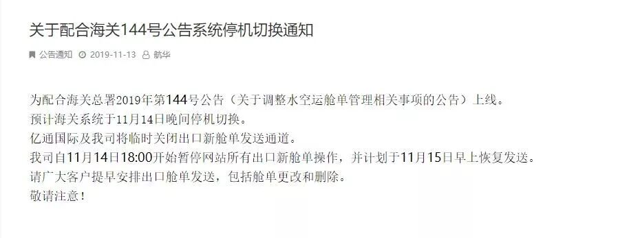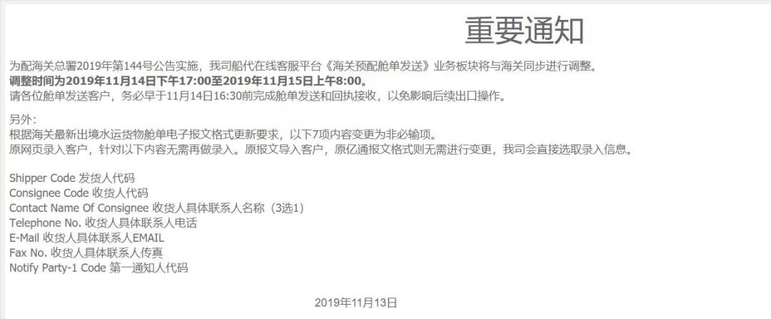 为配海关总署2019年第144号公告实施,《海关预配舱单发送》业务板块将与海关同步进行调整。调整时间为2019年11月14日下午17:00至2019年11月15日上午8:00。还请各位舱单发送客户,务必早于11月14日16:30前完成舱单发送和回执接收,以免影响后续出口操作。