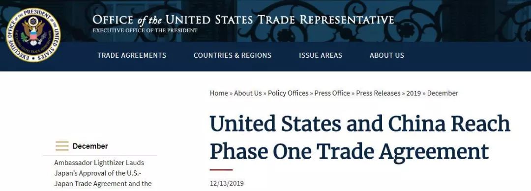 当地时间12月13日,美国贸易代表办公室(USTR)就中美第一阶段经贸协议发表声明: