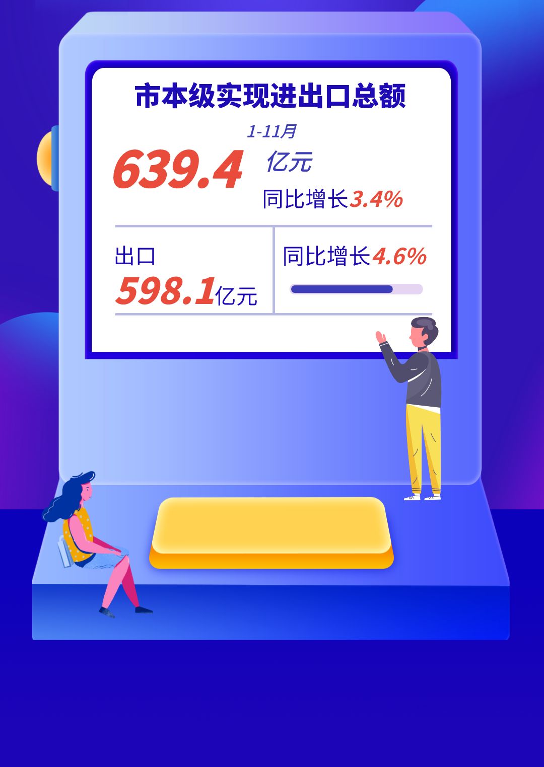 2019年,我市实施外贸实力效益工程建设。1至11月,市本级共有出口实绩企业2251家,增加110家,其中出口额超5000万元企业243家,超亿元企业131家,分别增加5家和16家。其中自营生产企业出口额509.2亿元,占比85.1%,增长8%。