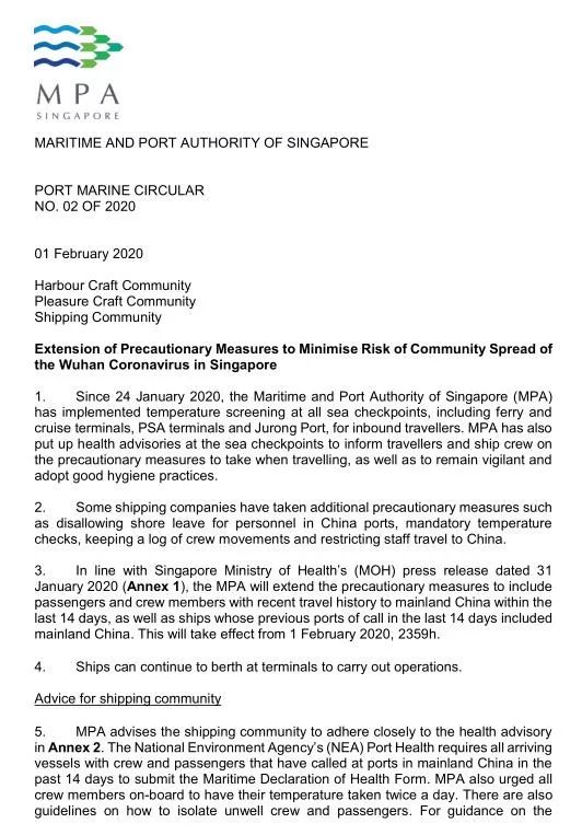 新加坡海事及港口管理局(MPA)2月1日发布通知称,依照新加坡卫生部此前发布的相关规定,MPA将会对过去14天内前往中国大陆的旅客和船员,以及在过去14天内曾在中国大陆停靠过的船舶,实施更加严格的预防措施,增加检疫流程,但不影响船舶靠泊作业。