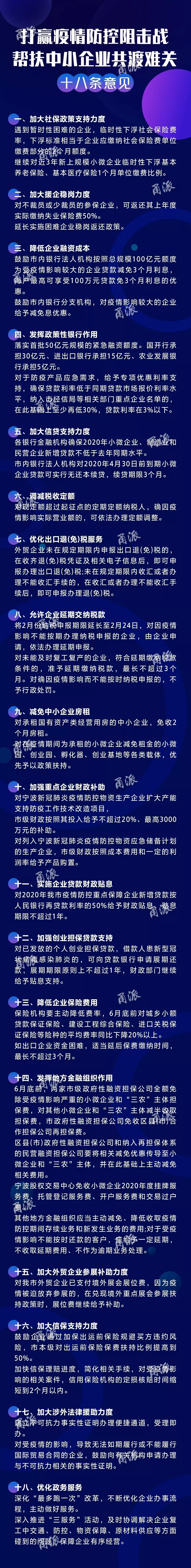 为帮扶中小企业共渡难关,宁波迅速研究并制订了《关于打赢疫情防控阻击战帮扶中小企业共渡难关的十八条意见》。该意见综合起来有五个方面内容——