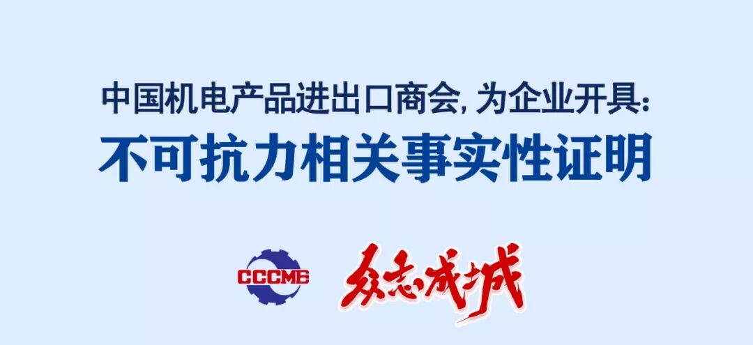 为坚决贯彻落实党中央、国务院决策部署,做好新型冠状病毒感染肺炎联防联控工作,维护企业的合法权益,帮助企业减少疫情损失,鉴于此次疫情的突发性、不可预见、不能避免及相关部门采取的管控措施,依据中国有关法律法规和国际贸易惯例,中国机电产品进出口商会(机电商会)将为相关企业开具与不可抗力相关的事实性证明。受“新型冠状病毒肺炎疫情”影响而无法如期履行或不能履行国际贸易合同的相关企业,可向我会申请开具与不可抗力相关的事实性证明。