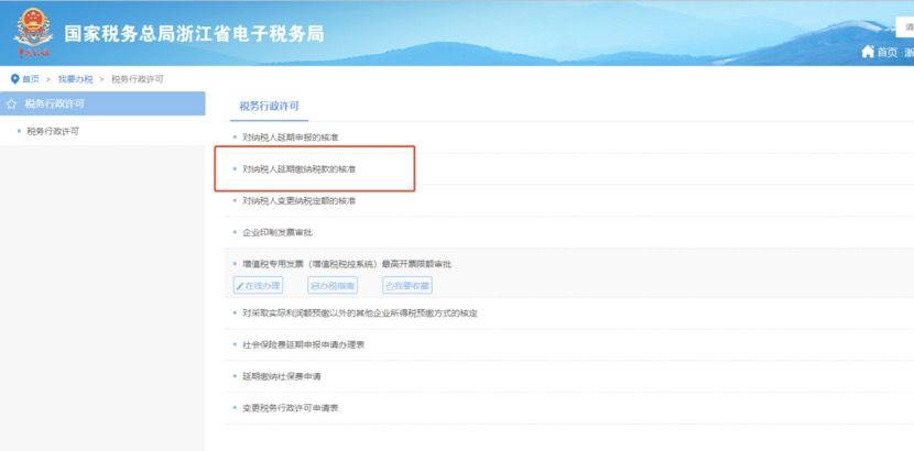2.点击“我要办税——行政许可——对纳税人延期缴纳税款的核准”