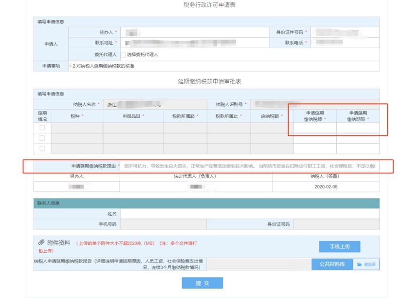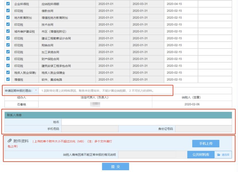 3.进入行政许可申请表填写界面,勾选需要延期申报的税种,并填写申请延期申报的期限及申请延期申报的理由,下拉选择联系人信息,上传相关附件材料后点击“提交”后显示保存成功。