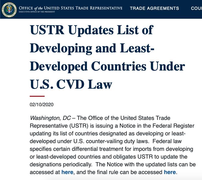 当地时间2月10日,美国贸易代表办公室(USTR)宣布,将对包括中国、印度、越南以及新加坡在内的25个发展经济体取消WTO补贴优惠待遇(Special and Differential treatment)。
