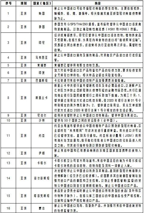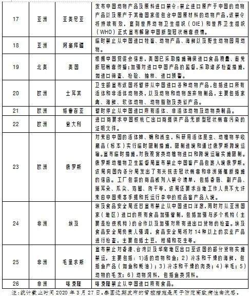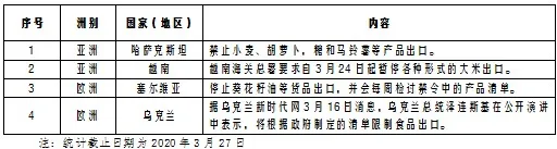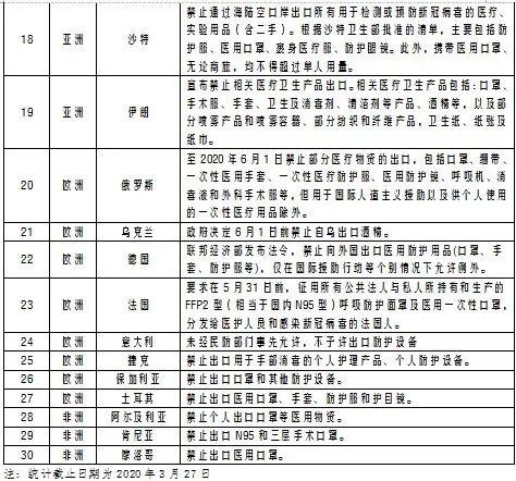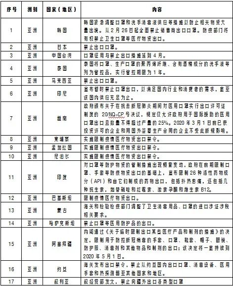 经查询国内外各类公开信息,据最新的不完全统计,全球范围内因疫情防控对中国货物实施进口限制/管控措施的国家(地区)总数已达26个,其中亚洲18个,北美洲1个,欧洲4个,非洲3个。具体情况如下表所示: 表1 因疫情防控对中国货物实施进口限制/管控措施的国家(地区)情况 据最新不完全统计的信息显示,海外针对口罩等防疫医疗物资出台相关管控措施的国家(地区)总数已达30个,其中亚洲19个,欧洲8个,非洲3个。从区域分布来看,仍然延续管控措施高度集中在亚洲(主要是发展中国家)的特点,而本期欧洲国家相关管控措施呈持续增多趋势,具体情况如下: 表2 因疫情防控对相关医疗物资出口实施限制/管控措施的国家(地区)情况 根据最新公开信息显示,近期颁布禁止或暂停粮食等食品出口的国家主要有哈萨克斯坦、越南、塞尔维亚、乌克兰,详情如下: 表3 近期颁布禁止或暂停粮食等食品出口的国家(地区)情况 美国首都关闭“非必要营运”,启动国防生产法。首都华盛顿哥伦比亚特区宣布将关闭所有的“非必要营运”。特朗普将正式启动《国防生产法》(DPA)的政府权力,以解决疫情造成医疗设备、用品短缺的问题;美国白宫官员和参议院领导人还就2万亿美元的经济刺激计划达成协议。 疫情对就业负面影响开始显现,物流从业人员感染可能进一步威胁贸易流通。加州州长纽森表示,由于疫情,过去两周内加州超100万人申请失业;而据当地媒体报道,亚马逊公司在美至少有9个仓库有员工确认感染了新冠病毒。涉及的仓库包括纽约州的皇后区,纽约史坦顿岛,加利福尼亚州莫雷诺谷,佛罗里达州杰克逊维尔,肯塔基州谢泼兹维尔,密歇根州布朗斯敦,俄克拉何马州俄克拉何马城,德克萨斯州的凯蒂以及康涅狄格州的沃灵福德。 美国疾控中心宣布接受KN95等中国标准口罩,进一步降低中国医疗用品对美出口技术壁垒。3月17日美国疾病控制与预防中心(CDC)发布《优化N95口罩供应策略:危机/替代策略》,指出新冠肺炎疫情期间,当N95口罩供给不足时,按照CDC规定的标准生产的产品,是N95口罩合适的替代品。其中包括采用中国标准GB 2626-2006、GB/T 18664-2002生产的口罩。详细标准请查询:https://www.cdc.gov/coronavirus/2019-ncov/hcp/respirators-strategy/crisis-alternate-strategies.html 美贸易代表办公室进一步豁免医疗产品进口关税,相关进口产品关税成本压力减轻。随着疫情在美国的蔓延,3月初USTR在同美国卫生与公共服务部(HHS)协商后,曾做出总计约200个的排除措施,涉及产品包括口罩、一次性医用手套、消毒湿纸巾、样本采集器皿等。当地时间3月25日,美国贸易代表办公室又公布了新一批对中国3000亿美元加征关税商品A清单下产品的公告,共涉及12项排除产品,包含医用冰袋塑料袋等产品,即本次排除清单中的产品,自加征实施之日起1年内免加征7.5%的关税。 欧盟限制欧盟外人员入境“非必要旅行”,为期30天。2020年3月17日欧盟成员国领导人就新冠肺炎疫情防控举行视频峰会,决定采取临时入境限制措施,限制欧盟以外人员前往欧盟国家的“非必要旅行”,为期30天。欧盟方面承诺建立快速通道,确保药品、食品和货物流通,确保欧盟公民能回国。 英国开始实施更加严格的管制措施。除购买生活必需品、外出锻炼、求医或核心工作者通勤以外,要求所有人必须待在家中,非同一家庭2人以上的聚集将被禁止;图书馆、露天健身房、祷告场所等也将关闭,人们除葬礼外不可举行纪念或宗教仪式。新规实施后,警察将有权驱散聚集的人群或进行罚款。新规将实施三周,届时如果疫情得到控制,将放松管制。 俄罗斯宣布3月28日至4月5日全国放假,仅必要民生机构开门营业。总统普京发表全国电视讲话,宣布原定于4月22日举办的宪法修正案全民投票将推迟举行。同时为遏制新冠肺炎传播,3月28日至4月5日全国放假,只有药店等必要的民生机构开门营业。 欧盟颁布强有力政策帮助缓解医疗防护物资紧张局面,暂时禁止或限制部分医疗物资出口。3月15日欧盟对外发布公告称,为保证欧盟内部的防护医疗物资供应,此类物资出口必须获得相关国家的授权。个人防护医疗用品包括:口罩、活动面罩和保护头盔等。法国取消对进口酒精消毒凝胶和口罩征收关税。《回声报》22日报道,法国公共行动和帐务部长达马宁周日表示,将不再对进口酒精消毒凝胶和口罩征税。 欧亚经济联盟也决定免除或降低部分用于预防和抗击疫情传播的医疗用品进口关税,并禁止出口个人防护物资。近日欧亚经济委员会通过决议,禁止向欧亚经济联盟境外出口各类个人防护物资。决议旨在保证欧亚经济联盟内部口罩、护目镜、防护服及其他物资的可靠供应,防止上述物资大量对外出口。联盟内部已就举行部门磋商达成原则共识,将讨论解决某一成员国出现物资短缺,以及相互供货和提供人道主义援助等具体问题。 近期印度中央政府与各邦政府开会后决定,封锁包括首都新德里市在内的受疫情影响严重的75个行政区。所有客运火车、地铁以及跨邦交通,全部禁止运行,市内建筑活动暂停,宗教场所全部关闭,并且关闭市内所有商业设施和工厂,至当地时间3月31日。除公布的75个行政区之外,印度政府还授权各邦根据其风险评估来扩大关闭区域的清单。根据印度时报的报道,目前印度全境内已经有82个地区被封锁,包括Andhra Pradesh(安得拉邦)、Telangana(泰兰加纳邦)、Punjab