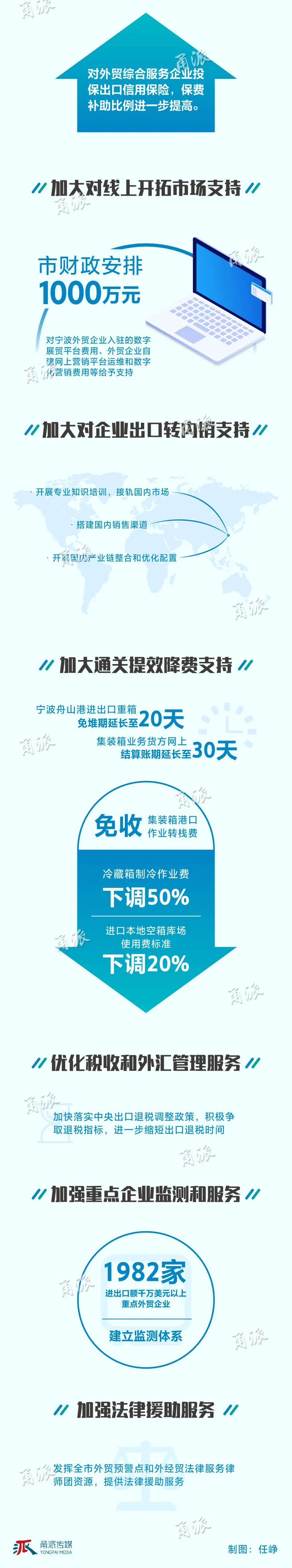 今天(30日)下午,宁波召开全市稳外贸工作电视电话会议,发布了全市“稳外贸”的新十条举措,在全国率先推出一系列“组合拳”,在融资、信保、通关、法律等方面精准帮扶企业共克时艰。加大财政金融扶持,扩大出口前保险覆盖面,鼓励发展跨境电商出口,支持搭建外贸综合服务平台,鼓励企业在线上开拓市场,积极推动出口转内销。同时,进一步推动通关提效降费,优化税收和外汇管理服务,加强法律援助服务等等。
