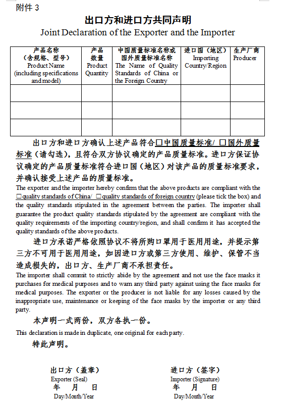 生产企业在商务部确认取得国外标准认证或注册的非医用口罩生产企业清单内的,或生产企业不在商务部确认取得国外标准认证或注册的非医用口罩生产企业清单内,但符合中国质量标准的,提交出口方和进口方共同申明。