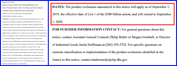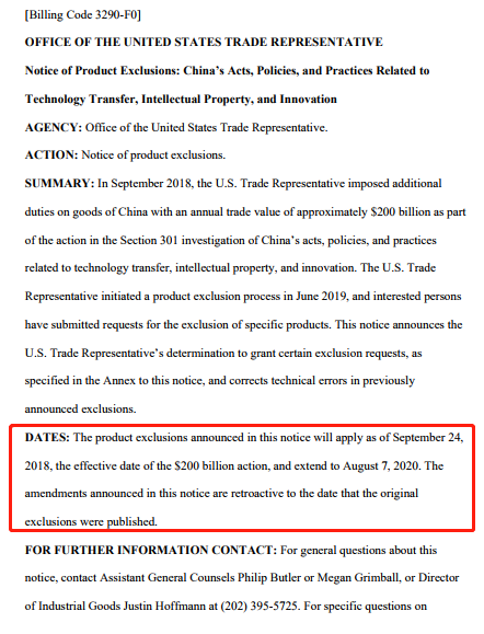 本公告中宣布的产品排除加征有效期为:2018年9月24日至2020年8月7日。