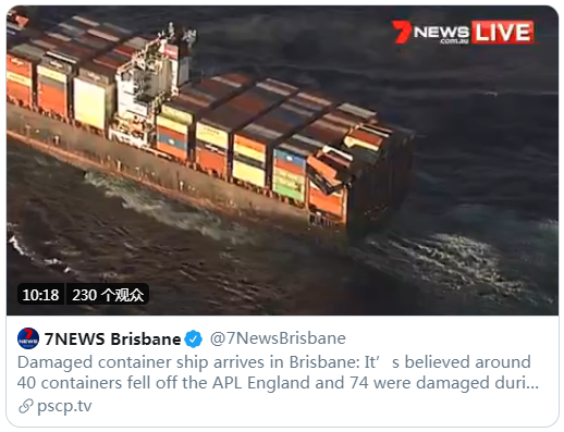 当地时间5月24日早晨6点,法国达飞旗下一艘满载中国货物的集装箱船在悉尼附近因风大浪急,导致至少40个集装箱坠海,此外还有74个遭到不同程度的损坏。