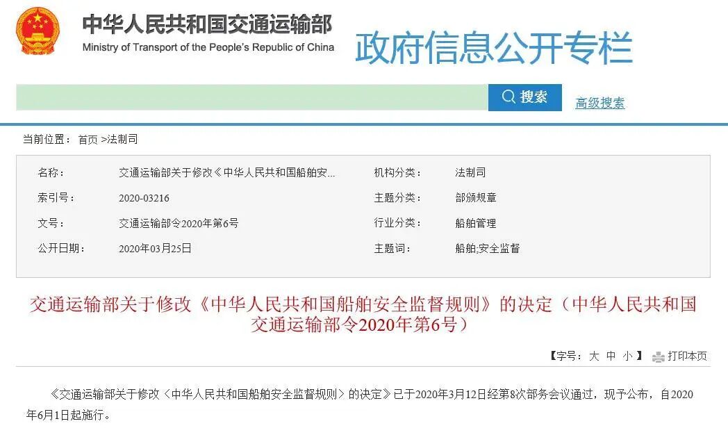 《交通运输部关于修改〈中华人民共和国船舶安全监督规则〉的决定》自2020年6月1日起施行。 交通运输部关于修改《中华人民共和国船舶安全监督规则》的决定 交通运输部决定对《中华人民共和国船舶安全监督规则》(交通运输部令2017年第14号)作如下修改: 一、增加一条,作为第四十七条:“拟交付船舶国际运输的载货集装箱,其托运人应当在交付船舶运输前,采取整体称重法或者累加计算法对集装箱的重量进行验证,确保集装箱的验证重量不超过其标称的最大营运总质量,与实际重量的误差不超过5%且最大误差不超过1吨,并在运输单据上注明验证重量、验证方法和验证声明等验证信息,提供给承运人、港口经营人。 采取累加计算法的托运人,应当制定符合交通运输部规定的重量验证程序,并按照程序进行载货集装箱重量验证。 未取得验证信息或者验证重量超过最大营运总质量的集装箱,承运人不得装船。” 二、增加一条,作为第四十八条:“海事管理机构应当加强对船舶国际运输集装箱托运人、承运人的监督检查,发现存在违反本规则情形的,应当责令改正。” 三、第五十条改为第五十二条,删去其中的“并可扣留船员适任证书6个月至12个月”、第一项、第五项。 四、增加一条,作为第五十六条:“违反本规则,在船舶国际集装箱货物运输经营活动中,有下列情形之一的,由海事管理机构处1000元以上3万元以下罚款: (一)托运人提供的验证重量与实际重量的误差超过5%或者1吨的; (二)承运人载运未取得验证信息或者验证重量超过最大营运总质量的集装箱的。” 五、第五十六条改为第五十九条,增加一款,作为第四款:“本规则所称最大营运总质量,是指在营运中允许的包括所载货物等在内的集装箱整体最大总质量,并在集装箱安全合格牌照上标注。” 条文序号作相应调整。 本决定自2020年6月1日起施行。 《中华人民共和国船舶安全监督规则》根据本决定作相应修改,重新发布。 资料来源:交通部网站 编辑:Robin 媒体合作:010-88379140 声明:本文所用素材部分来源于网络,如涉及版权问题,请及时与我们联系。