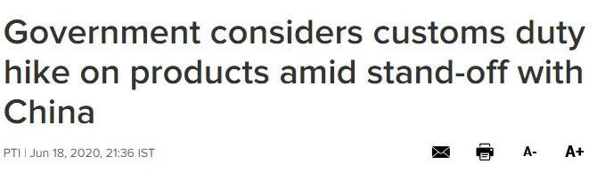 近日据印度媒体报答和行业人士透露,鉴于中印近期发生的一系列事情,中印贸易成为了印度对准的苗头,印度媒体发起来抵制中国产品的运动(印度人又开始了……)。在6月18日起印度商务部和财政部就在商议提高从中国进口商品的关税,以增强印度制造实现印度自给自足。不过截止现在为止,该提议还没有最终得到确定。