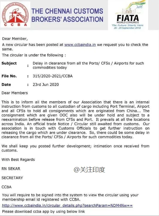 但是今天却在印度外贸行业广泛传开了一件事情。那就是印度钦奈港停止对所有来自中国货物的清关工作,周一晚上开始对所有来自中国货物100%实施检查(在此之前是随机检查)。这一举动被认为是印度政府对所有来自中国货物在西海岸港口的限制。清奈港是电讯部件和设备的重要港口,很多中国公司货物进口都是从该港口进行清关然后进入印度市场。昨日(6月23日)印度清奈港口报关代理人协会(CCBA)内部也对所有代理人成员发布了内部清关延迟通知,要求对所有来自中国的货物清关工作暂停,清关已经完成的货物也需要重新进行检查,并遍及到整个印度港口和口岸。官方通知目前尚未发布。货物的释放需要协会进一步与海关人员联系确认后才能允许,因此中国货物的清关工作将会有延迟。