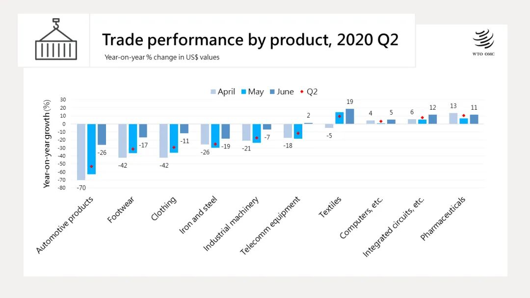 根据WTO统计,自Q2季度以来,全球药物用品、集成电路、电脑及纺织用品(主要含防疫物资)率先反弹,而前期拖尾严重的整车汽配、鞋履、服装、钢铁产业则自二季度起不断收复失地,不断补涨三季度出口。